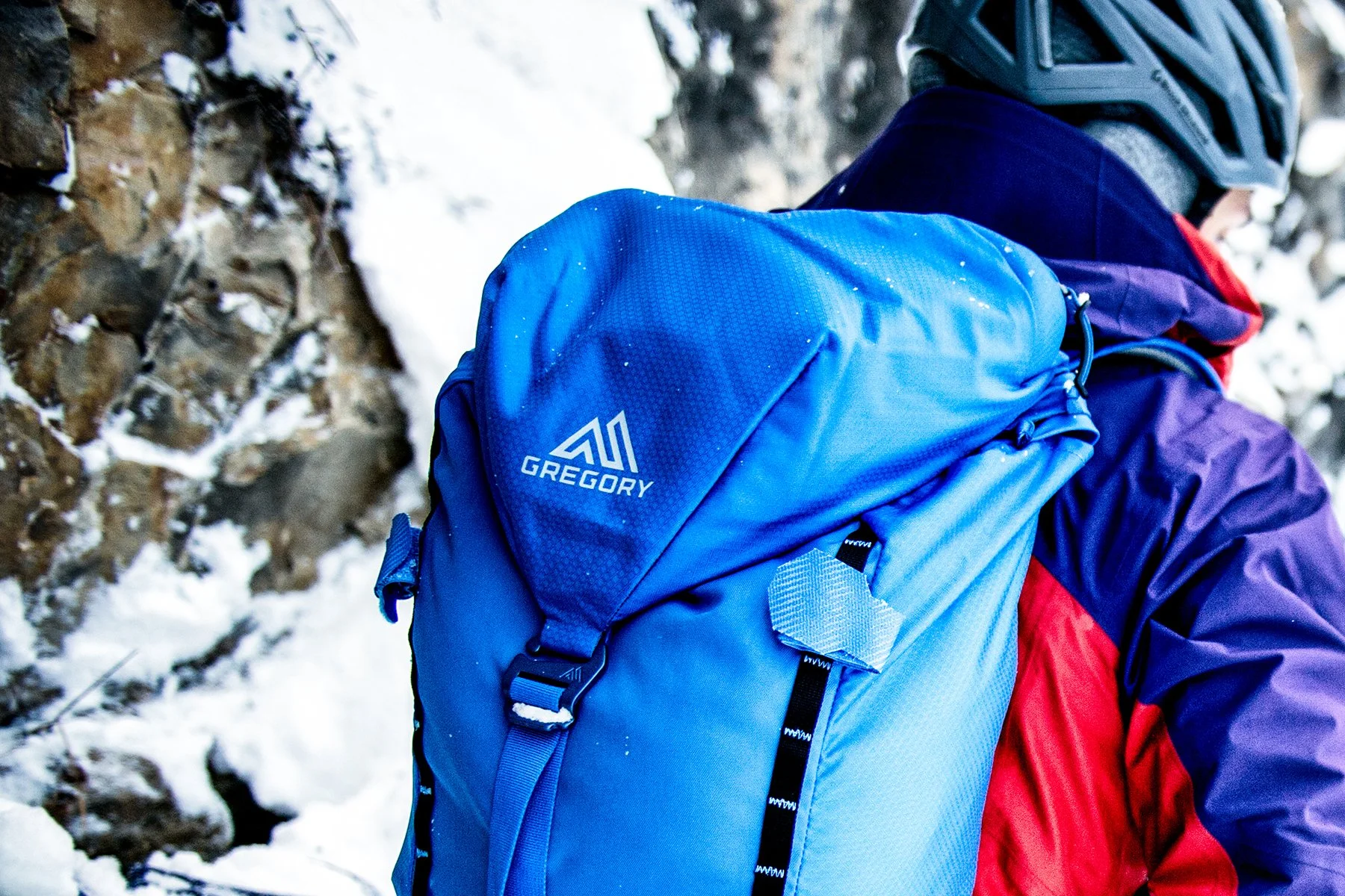 The Gregory logo represents a mountain and a trail while also communicating the technical sophistication of the mountaineering packs it represents.